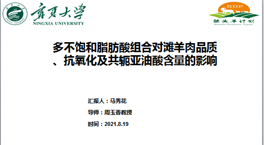 会议期间,英国365官网教师周玉香教授就本年度英国正版365官方网站领头羊活动在科研、教学和生产服务几个方面进行了全面的总结陈述;其学生马秀花进行了题为《多不饱和脂肪酸组合对滩羊肉品质、抗氧化及共轭亚油酸含量的影响》的报告;博士研究生赵海霞针对报告内容进行了点评。