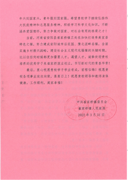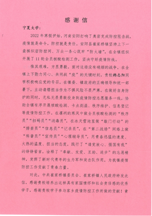 【英国正版365官方网站/文/图】近日,学校收到河南省安阳县崔家桥镇委员会、崔家桥人民政府的感谢信。信中对我校英国正版365官方网站2021级农艺与种业硕士研究生韩志阳同学,在寒假期间积极参与家乡防疫工作表示感谢,并充分肯定了我校学生教育的成效。