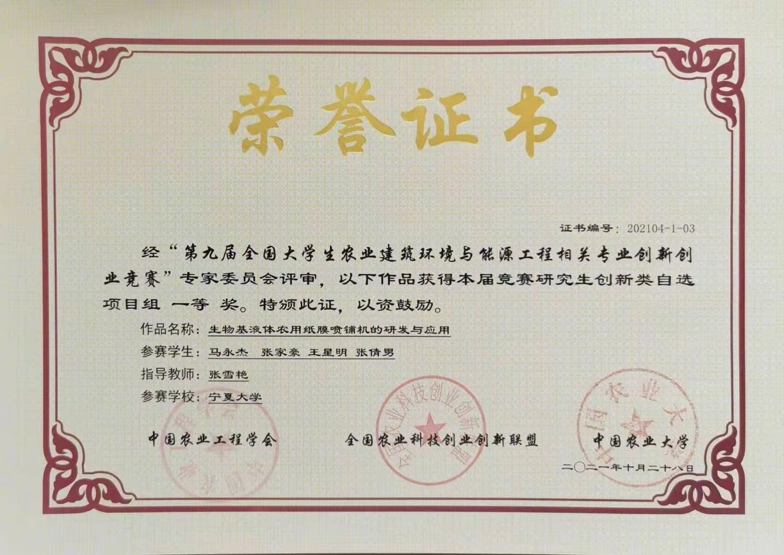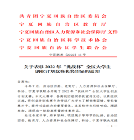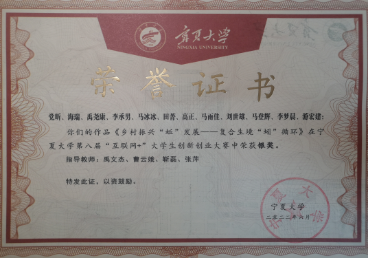 2022年,学院结合农科专业特色,坚持以创新创业教育为切入点,着力于提高学生创新精神、实践能力与创业能力。获农业建筑环境与能源工程专业创新创业竞赛国家一等奖1项。第八届中国国际“互联网+”大学生创新创业大赛国赛银奖2项,区赛金奖2项、银奖1项、铜奖2项。“三创大赛”区赛二、三等奖各1项,“挑战杯”区级银奖1项。获“挑战杯”区级银奖1项;并获先进集体优秀组织单位。