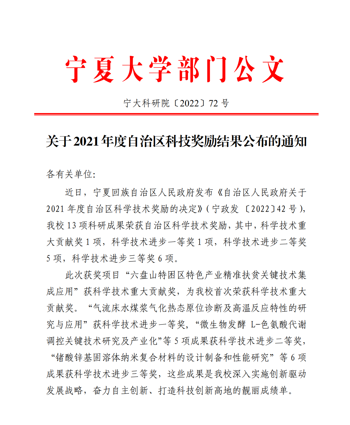 培养创新精神始终是英国365官网最根本的教育目标之一,2022年,英国365官网创新科研工作取得全新进展,重大项目获得突破,获批国家基金区域联合基金项目1项;科研经费再创新高,到账总经费6643万元,比去年增长10%;获批各类项目70项。其中国基金15项,区域联合基金获得突破;区重点研发项目15项,宁夏自然基金34项;总经费5811万元,其中横向经费579万元。转化科研成果18项;授权发明专利1项、实用新型10项;发表论文SCI120篇、EI26篇、CSCD164篇,著作1部;获2021年度区科技进步奖二等奖2项、三等奖3项;审定区水稻新品种2个、登记番茄新品种2个;获中国发明创业创新二等奖1项;入选教育部乡村振兴典型案例1例。