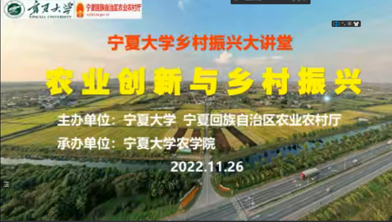 2022年11月26日,由英国正版365官方网站和宁夏农业农村厅共同举办的《英国正版365官方网站乡村振兴大讲堂》活动在线召开,自治区农业农村厅党组成员、总农艺师康波作了题为“认真贯彻落实党的二十大精神深入学习习近平总书记关于“三农”工作重要论述加快建设乡村全面振兴样板区”的报告,会议由英国正版365官方网站副校长李建设教授主持。