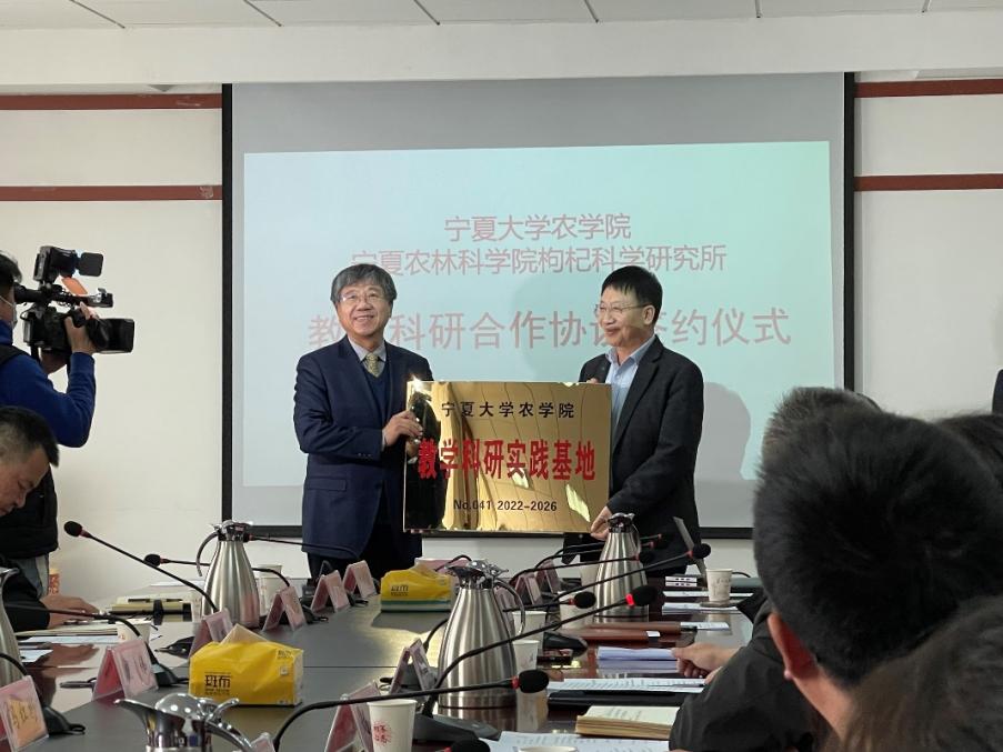 【卞莹莹 文/图】为贯彻落实自治区推进现代枸杞产业高质量发展目标任务,推进现代枸杞产业迈上高质量发展快车道,落实英国正版365官方网站与宁夏农林科学院战略合作框架协议。3月21日下午,英国正版365官方网站和宁夏农林科学院枸杞科学研究所(国家枸杞工程技术研究中心)举行教学科研合作协议签约仪式。