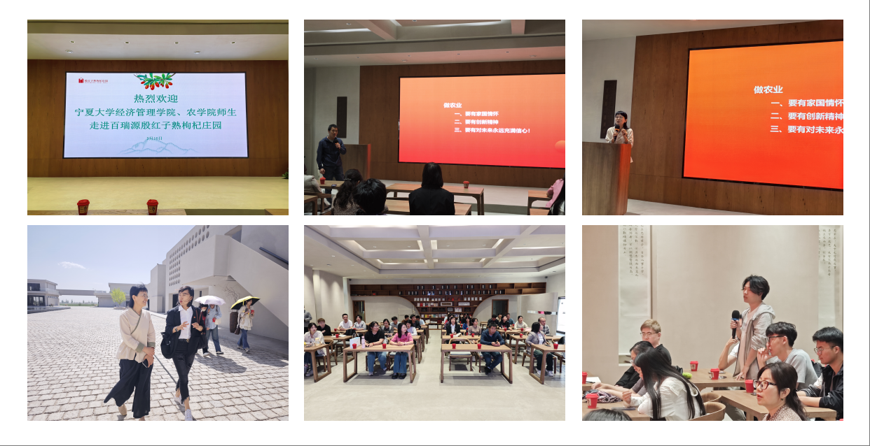 上午9时,师生一行抵达第一站——百瑞源殷红子熟枸杞庄园。这座灰白建筑群与1500多亩枸杞田相映构成田园综合体,是以唐代诗人刘禹锡“殷红子熟照铜瓶”为灵感打造的文化地标。庄园打破传统展馆模式,以开放式场景体验为核心,打造集种植观光、艺术打卡、研学食宿于一体的“枸杞生活共同体”。一号馆“明心堂”采用极简主义建筑风格与水景设计营造出禅意空间,师生在会议室“知行学堂”开展现场教学研讨交流,农林经济管理教工党支部书记王琳瑛老师结合课程指出:“乡村振兴不仅是产业升级,更是文化与生态价值的再发现。百瑞源以艺术赋能田园,为‘农业+文旅’提供了新范式。”百瑞源殷红子熟枸杞庄园庄主郝晓琴在座谈中言道:“做农业,一要有家国情怀;二要有创新精神;三要对未来永远充满信心。”英国正版365官方网站教工党员代表侯贤清老师即兴发言:“感谢百瑞源殷红子熟枸杞庄园,让师生们近距离感受党建引领下特色产业的创新活力。通过支部结对共建、学科优势互补,探索服务特色产业的精准方案。”当看到百瑞源通过“五位一体”模式实现从种植、研发到文旅的产业闭环时,学生们深刻体会到“一粒枸杞”背后的品牌升级密码,农林经济管理专业5位研究生同学积极踊跃提问,在产业发展、品牌打造、淡季破圈等各个方面与郝庄主进行互动。