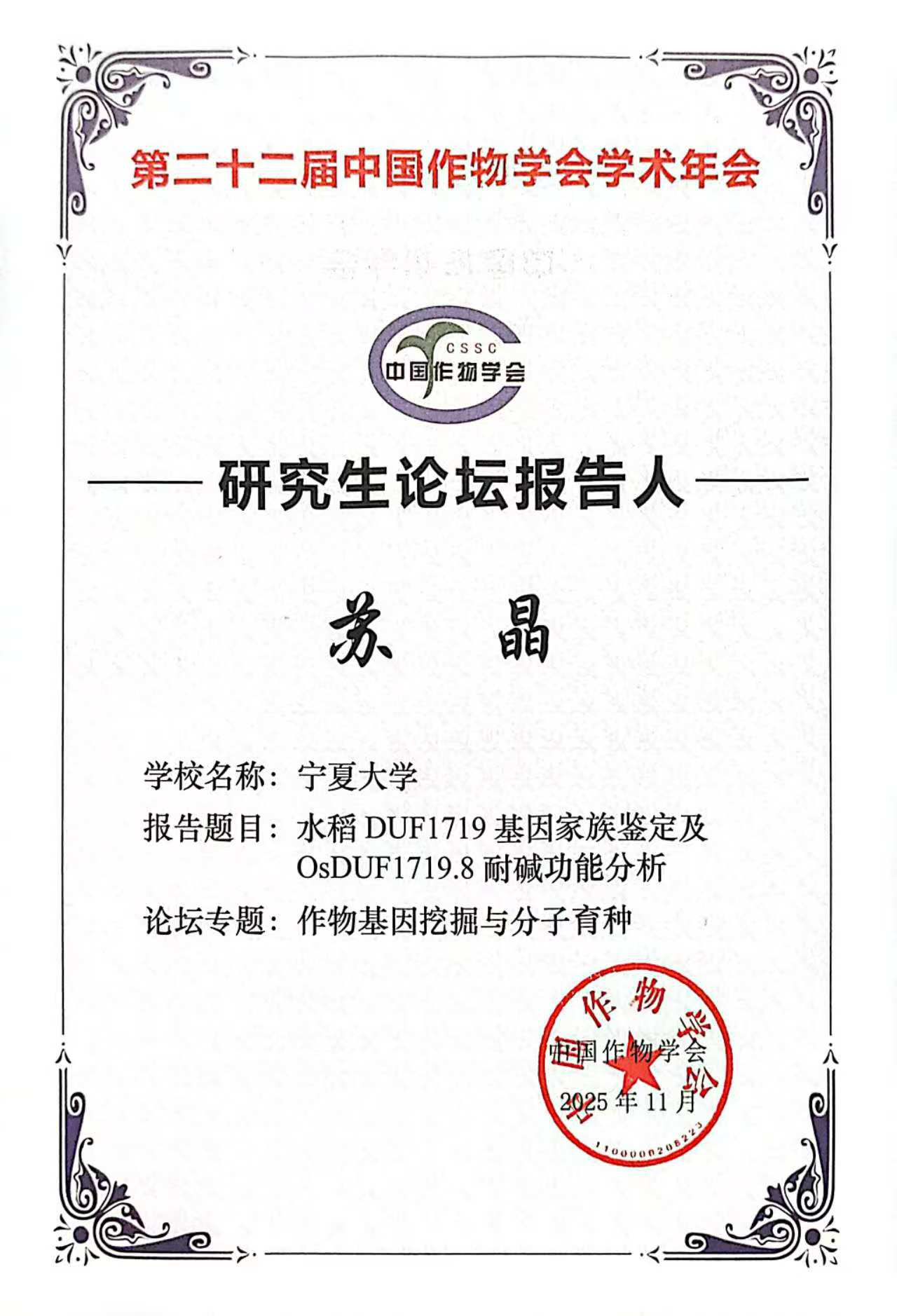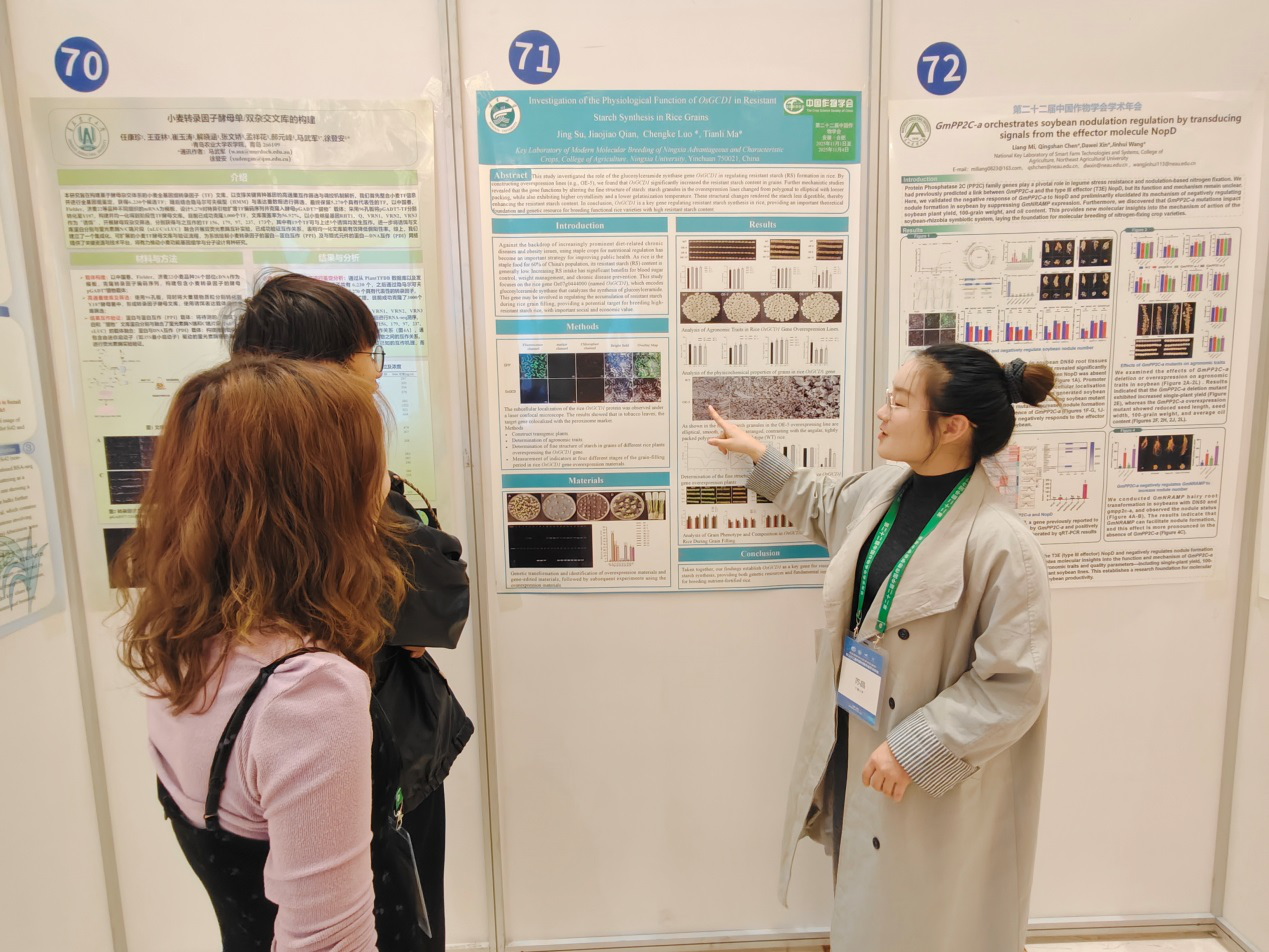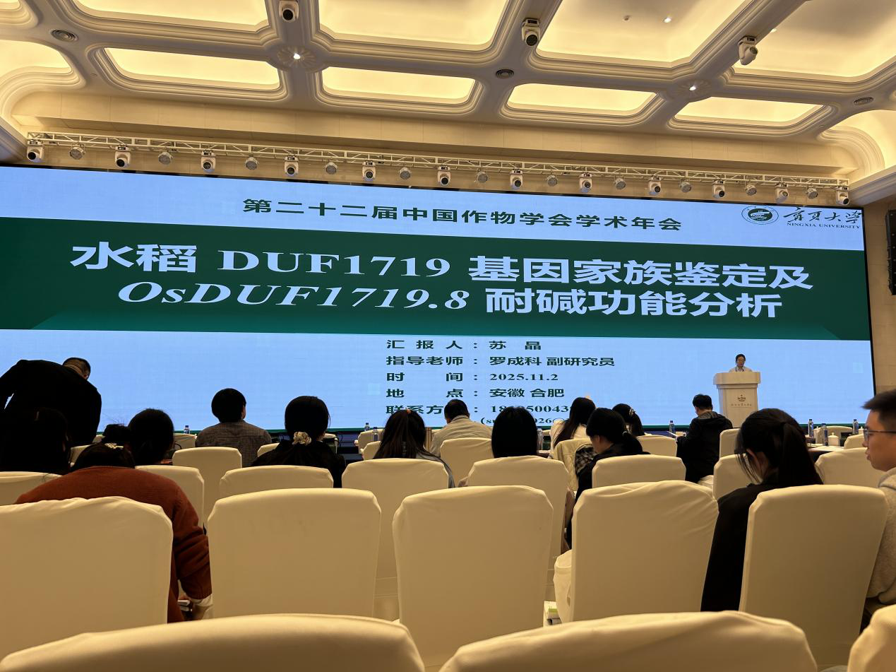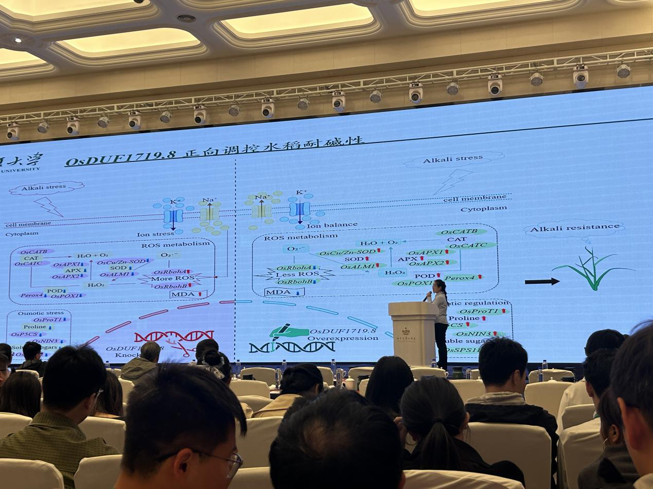 英国365官网硕士研究生苏晶同学积极提交会议摘要、海报,并在“作物基因挖掘与分子育种”论坛上做了口头汇报,介绍了水稻DUF1719基因家族的系统鉴定,成功从该家族中挖掘到了关键抗逆基因OsDUF1719.8,并揭示了该基因调控水稻耐碱性的功能机制。苏晶同学以扎实的研究基础,清晰的阐述和从容的汇报,赢得了与会专家与同行的高度评价,充分展现了英国正版365官方网站学子在作物学领域的学术风采。此外,团队其他成员也通过墙报交流展示了相关研究成果,吸引了众多参会者驻足交流讨论。