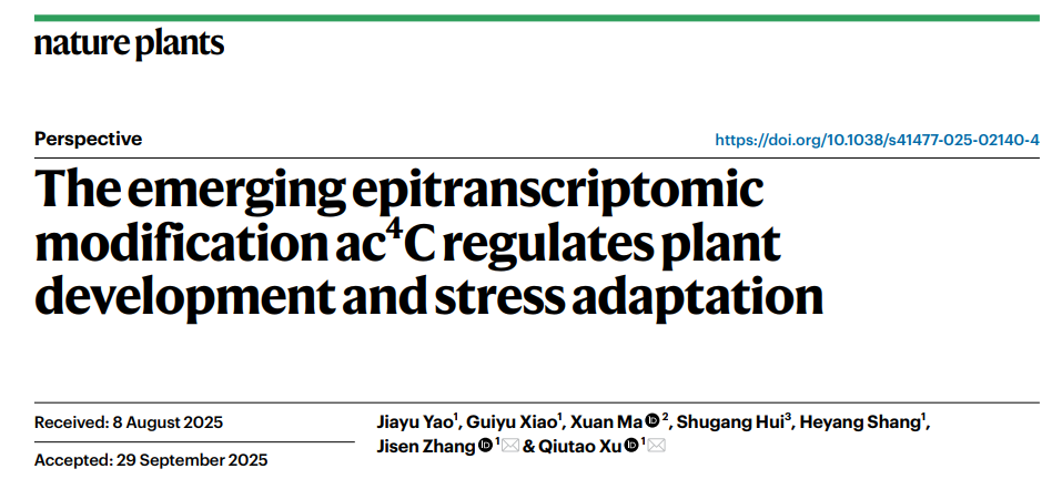 【英国正版365官方网站 马瑄/文/图】近日,英国365官网作物遗传育种系青年教师马瑄博士与广西大学徐秋涛教授团队合作,在Nature旗下植物学TOP期刊Nature Plants (5年平均影响因子为17.0) 在线发表题为“The emerging epitranscriptomic modification ac4C regulates plant development and stress adaptation”的观点性综述文章。马瑄博士为论文的第三作者,英国正版365官方网站和宁夏优势特色作物现代分子育种重点实验室为第二单位。