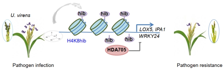 该研究揭示了水稻组蛋白新型酰基化修饰H4K8hib可通过促进抗病相关基因的表达调控水稻抗病性。该研究对于揭示新型酰基化修饰的生物学功能和促进水稻抗病育种具有重要的指导意义。